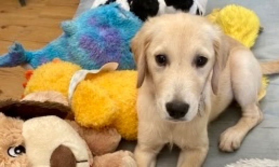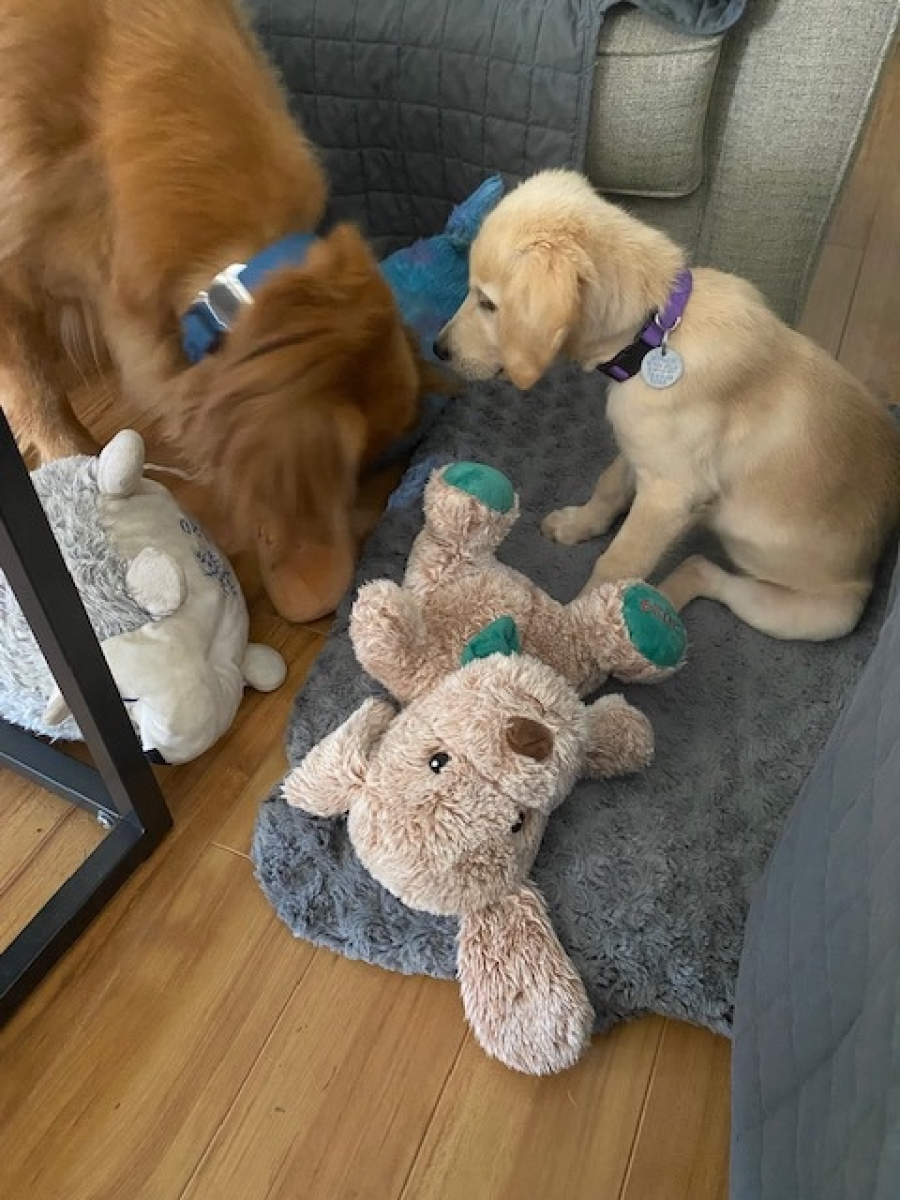 Hello! My name is Estella, or Stella for short, but my foster mom calls me Bitsy! I’m only twelve weeks old and ready to meet my forever family. I love soft toys, doing zoomies in the yard, chasing flying insects, but I love spending most of my time with my foster mom and brother. I’m very curious so my mom has to keep “eyes on” at all times. I haven’t been a chewer, but I’m a carrier. I love to pick up shoes and move them from place to place.